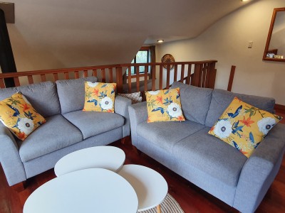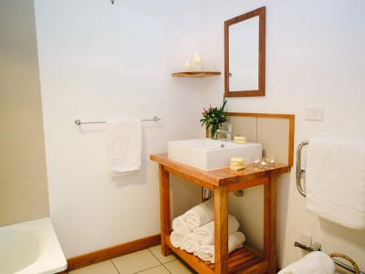 Tucked into the trees, the self-catering cottage is ideal for a couple; the king bedroom which opens directly onto the lawns has an en suite bath and shower. The second Queen bedroom, also with en suite bathroom, can either be used as a spacious dressing or second bedroom catering for 2 couples or a small family of up to 4 guests.