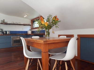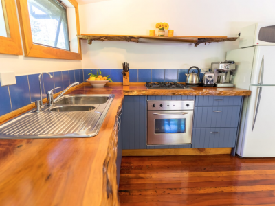 Two double en suite bedrooms on the ground floor open directly into the gardens. A spacious hallway featuring antique wooden stairs leads up to the sunny northfacing open plan living area. The fully equipped kitchen area is designed for self-catering (with a gas hob and electric oven, espresso coffee machine, fridge/freezer, microwave, crockery, utensils and appliances). The living area features beautiful reclaimed timber floors and relaxing sofas, and flows out to the private north facing sun deck. Equipped with a gas bbq, tables and chairs, sun loungers and its own private romantic alfresco claw foot bath with limitless hot water, the deck is the perfect place to relax. A unique lookout tower perched above the cottage offers guests beautiful river views. River Cottage also has a cosy wood fire.