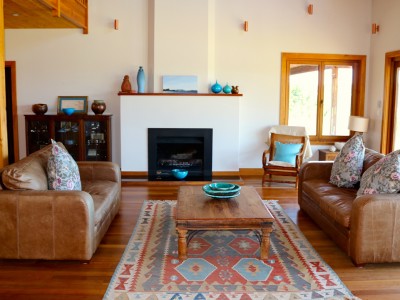 Our home is beautifully handcrafted featuring polished timber floors, hand-made rugs, antiques, bespoke furnishings and New Zealand art. The majestic double height lounge forms the centrepiece of the house and features beautiful cathedral ceilings, an open fire, tri-fold doors opening onto the decks and a mezzanine balcony. Folding glass doors separate the formal lounge from the sunny family living area, which has a cosy wood burner and further bi-fold doors opening onto wraparound decks to take in the sweeping ocean views.